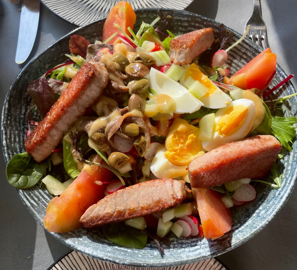 We ooed and awed at the nice views then tried to no avail to get into one of the hilltop restaurants. Parched and hungry, we walked back down to a sidewalk patio in town and paid $35 for salad. But it was the best Nicoise salad we’ve ever had, with a real tuna steak, and the beer was cold. Finishing up lunch, we eyed the 100 or so people at the bus stop waiting to leave town. That wasn’t going to happen.